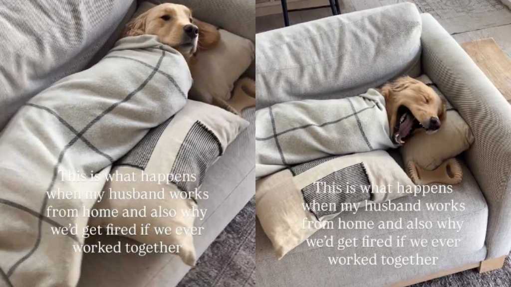 In the meantime, the dog’s dad could be seen standing right next to him after finishing wrapping him up into a “burrito.” Meanwhile, in the text written over the clip, the mom of the furbaby penned, “This is what happens when my husband works from home, also why we’d get fired if we ever worked together.”
