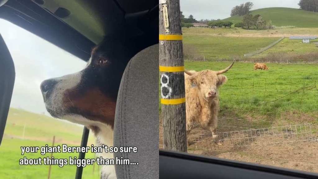 The video’s caption explains the Bernese Mountain Dog’s reaction: “He’s used to being the biggest floof in the land – guess we’re not getting a cow in our future.”