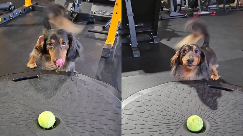 In an Instagram video from creator @morgan.rolo.pebbles, a Dachshund named Rolo stands in front of a round dog toy with a tennis ball and communicates with his owner. He locks in like he is running a serious meeting. Meanwhile, the onscreen text sets the premise, reading, “My dachshund is communicating clearly.”