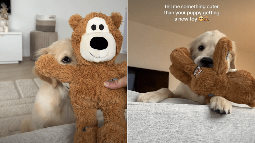 A clip by Instagram user @george_thatgoldenboy has quickly charmed viewers by showcasing one dog’s pure excitement over a simple gift. The video features George, a Golden Retriever puppy, being presented with a new plush toy while relaxing at home. The moment his owner places the toy near him, George gently takes it in his mouth, almost as if he is carefully inspecting his new treasure before fully committing to playtime.
